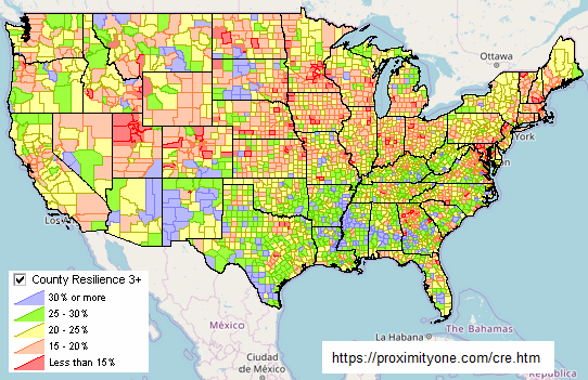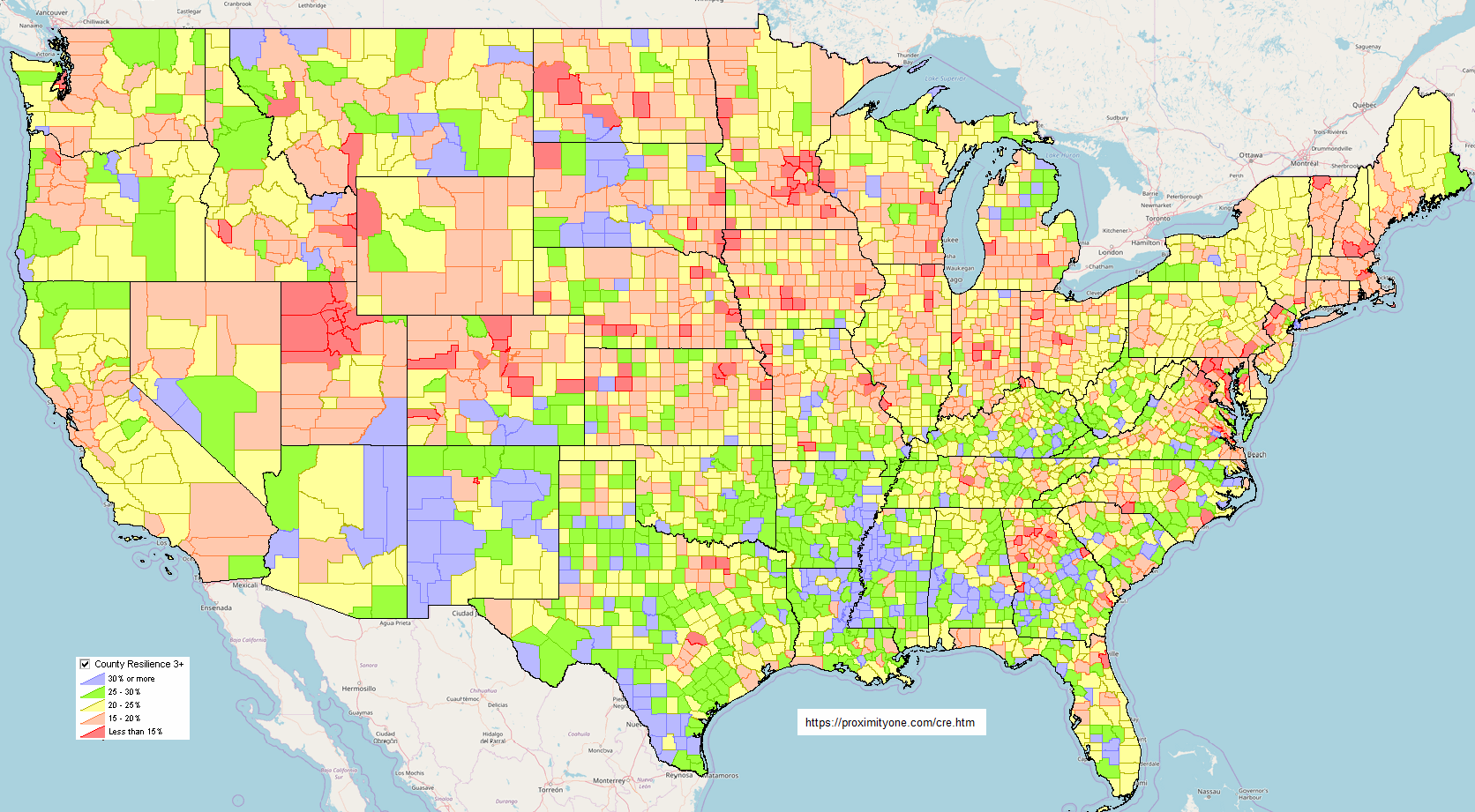 U.S. by tract 120th Congressional Districts 120th Congressional Communities County Resilience 2024 Interactive Table .. goto top Use the buttons & tools below the table for most effective use of this table and data. Click ShowAll button between Find/Queries. Use mouseover on column header to view column description. See usage notes below table. Usage Notes .. Click header cell to sort; click again to sort in other direction. .. Use buttons below table to query or place filters on the table. Column notes: County Name St GeoID -- FIPS StCty Vintage 2025 Estimates: Population 2020 Population 2025 Population Change 2020-25 Population PctChg 2020-25 Resilience: POPUNI -- Total population, excludes residents in adult correctional/juvenile facilities and college dormitories. 0_E -- Estimated number of individuals with zero components of social vulnerability 0_M -- Estimated margin of error for individuals with zero components of social vulnerability 0_PE -- Rate of individuals with zero components of social vulnerability 0_PM -- Rate margin of error for individuals with zero components of social vulnerability 12_E Estimated number of individuals with one-two components of social vulnerability 12_M -- Estimated margin of error for individuals with one-two components of social vulnerability 12_PE -- Rate of individuals with one-two components of social vulnerability 12_PM -- Rate margin of error for individuals with one-two components of social vulnerability 3_E -- Estimated number of individuals with three plus components of social vulnerability 3_M -- Estimated margin of error for individuals with three plus components of social vulnerability 3_PE -- Rate of individuals with three plus components of social vulnerability 3_PM -- Rate margin of error for individuals with three plus components of social vulnerability Using iVDA & Community Resilience .. goto top .. login within 10 minutes .. no cost. .. iVDA part of Visual Data Analytics .. about VDAGIS below .. iVDA works on any device; iPhone (not recommended due to screen size) .. iVDA is an iframe version of VDA Web GIS4 ..open related VDA Web GIS4 The default item mapped in layer "County Resilience 3+" is "Rate of individuals with three plus components of social vulnerability" in the interactive table. iVDA is presented below in an interactive mapping window ... Regional Looks at Metros Containing Fastest Growth (2020-2025) Counties .. see iVDA display above for thematic map color patterns Kaufman County, TX in Dallas MSA .. see pointer ![]() Jasper County, SC in Hilton Head MSA .. see pointer ![]() .. maps prepared using VDA.GIS project and VDAGIS tools About VDAGIS .. goto top The Visual Data Analytics (VDA) Geographic Information System (GIS) is a suite of tools and data that you can use to examine multi-sourced geographic, demographic and economic data. VDAGIS resources are developed and maintained by Warren Glimpse, ProximityOne (Alexandria, VA) and Takashi Hamilton, Tsukasa Consulting (Osaka, Japan). See more about VDAGIS. Add your own data. Web Sessions Join us in the weekly web sessions where we review wide-ranging topics on current and trending geographic-demographic-economic characteristics tools to access & use demographic-economic data with other data using decision-making information & developing insights Additional Information ProximityOne develops geodemographic-economic data and analytical tools and helps organizations knit together and use diverse data in a decision-making and analytical framework. We develop custom demographic/economic estimates and projections, develop geographic and geocoded address files, and assist with impact and geospatial analyses. Wide-ranging organizations use our tools (software, data, methodologies) to analyze their own data integrated with other data. Contact us (888-364-7656) with questions about data covered in this section or to discuss custom estimates, projections or analyses for your areas of interest. |