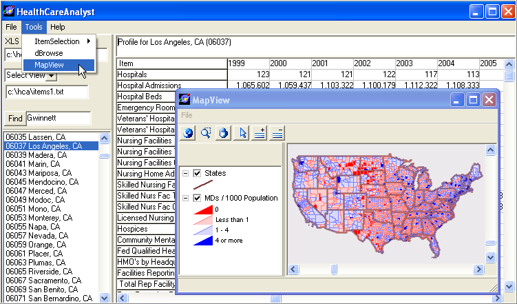 Despite the attention being given to a U.S. health care reform, it is very challenging to analyze characteristics of the health care market/industry. Will Medicare funds "run-out" in 11 years? How large is the Medicare base in your county/region(s) of interest? How might the population be impacted in these areas? Compared to other areas? The U.S. Health Resources and Services Administration (HRSA) Area Resource File (ARF), updated annually, contains multi-sourced data on several thousand health care-related measures at the county level. The HealthCareAnalyst software makes it easy to access the ARF data -- without any data conversion. Use features of the HealthCareAnalyst software to integrate other data with data in the ARF resource. HealthCareAnalyst updates enable users to directly analyze data contained on current and future editions of the ARF disc (not distributed by Proximity, available via HRSA). The HealthCareAnalyst (HCA) software enables use of the ARF and other data and examine characteristics the healthcare market and industry composition and trends. Flexibly choose from the more than 6,000 subject matter items and create your own profile. Easily select any county and view a health care characteristics profile based on your criteria. The same health care characteristics profile is also written as an Excel file for further use. Export data from the very large ARF database into dBase structure for use with other applications. Examine health care patterns using inetgrated MapViewer, CommunityViewer, or other GIS software. With almost no learning, you are able to immediately start using HCA. Optionally integrate data from other sources. Using the HCA main form, click on a county to view a time series profile of selected items for the area. In the following HCA view, the Tools>MapView has been selected to display a thematic map.