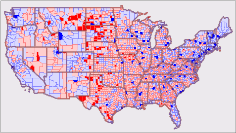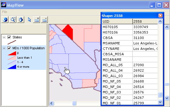 The above CV map shows the number of MDs per 1,000 population for the U.S. by county. Darker red: no MDs, light red: 1 MD per 1,000, light blue: 1-3 MDs per 1,000, dark blue: 4 or more MDs per 1,000 population (based on 2005 data). Zoom into a region of interest. Use the Identify tool to view a county profile. This view shows a mini-profile for Los Angeles County. The subject matter items are a combination of ARF sourced data (MD fields) and other fields.