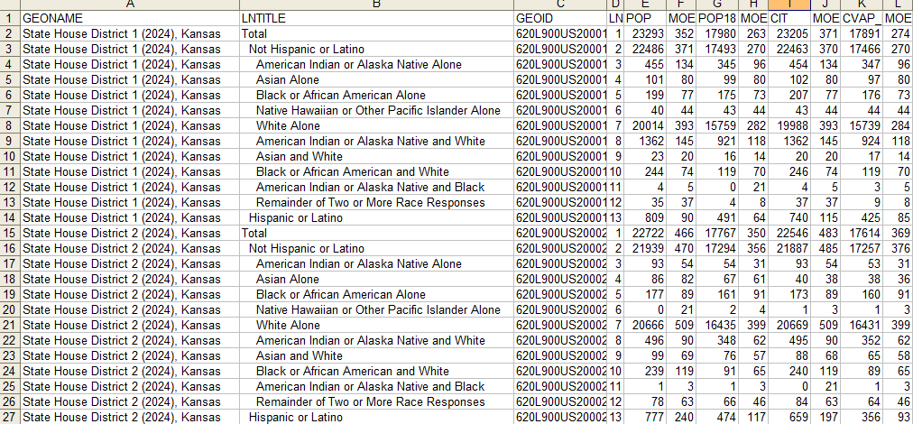 State Legislative Districts The tools used here apply to any state's 119th Congressional Districts and 2024 State Legislative Districts. Kansas is used to illustrate the process. Kansas contains four 119th Congressional Districts (CDs) and 125 Lower State Legislative Districts (House - SLDLs). This section provides access to tools to examine these CDs and SLDLs to conduct political analysis. In the 2024 general election, Republicans strengthened their supermajority in the Kansas House of Representatives, gaining three seats to reach a total of 88 seats (up from 85), while Democrats fell to 37 seats (down from 40). Because the threshold for a supermajority in the 125-seat chamber is 84, this result ensures Republicans maintain a veto-proof majority, allowing them to override the Kansas Governor's vetoes. Table of contents 1. Statewide House 2024 Election Results 2. Kansas House Election Results 2024 3. Using VDA to Examine Kansas Congressional Districts and State Legislative Districts 4. Join us in a Web Session 5. ACS 2024 Citizen Voting Age Population by Race 6. ACS 2024 Data Profiles 7. Vintage 2025 Population Estimates and Components of Change 8. TIGER 2025 -- Topologically Integrated Geographic Encoding and Referencing 9. Congressional Communities 10. Data Sources 11. Intended Users 1. Kansas House Election Results 2024 -- Statewide View .. Red R; Blue D .. static map generated from interactive iVDA below (details). .. click graphic for larger view. ![]() 2. Kansas House Election Results 2024 Use the buttons & tools below the table for most effective use of this table and data. Click ShowAll button between Find/Queries. Use mouseover on column header to view column description. See usage notes below table. Usage Notes .. click header cell to sort; click again to sort in other direction. .. use buttons below table to query or place filters on the table. .. enter a city name and click Find City to view SLDs in that area. .. county button is not active. Items in Table .. District .. Kansas House Code .. Incumbent .. elected in November 2024 .. Incumbent Party .. Incumbent Votes .. votes for incumbent .. Incumbent Percent of total votes .. GeoID .. Federal code for house district .. City .. primary city of district .. Total Vote .. total votes in this district .. Uncontested .. U indicates there was no opponent .. CVAP235 .. Citizen Voting Age Population; American Community Survey 2023 5 year data .. Total Votes / CVAP235 .. ratio of Toral Votes (adminstrative data) to CVAP235 .. $MHI 235 .. Median Household Income ACS 2023 3. Using VDA to Examine Kansas Congressional Districts and State Legislative Districts .. goto top .. the starting view shows SLDL 79 (GeoID 20079) with a bold black boundary, .... cities/places shown with black boundary and name, .... and thematic pattern of citizen voting age population by block group. .. use VDAW4 for full-screen view. See below for more detail. .. note that without a login, the application will prompt for a login after 10 minutes. .... with a login, you will be a Level 1 user with unlimited time. No fee. .... next time use your login ID (e-mail) and password. Example To replicate the first static view, proceed as shown here from start screen. In Legend Panel .. .. uncheck layer Cities Name .. uncheck layer SLDL 24 .. check layer SLDL 24 Party .. uncheck layer Block Groups ACS 23 CVAP .. click More Detailed Featured of the GIS Project .. goto top - provided to subscribers. Use VDA GIS for Further Analysis .. goto top The Visual Data Analytics (VDA) Geographic Information System (GIS) was used to develop the above maps. You can use VDA GIS to develop variations of the maps; different intervals, colors, zooms, etc. There is nothing to install. VDAGIS tools and data have been developed and are updated/supported by Warren Glimpse/ProximityOne/Alexandria, VA USA and Takashi Hamilton/Tsukasa/Osaka, Japan. 4. Join us in a Web Session .. goto top Learn more about accessing and using demographic-economic data and related analytical tools. Join us in a Web session. No fee. Learn about the American Community Survey (ACS 2024} and Vintage 2025 population estimates and components of change. The open structure also provides for Q&A and discussion of application issues of interest to participants. 5. ACS 2024 Citizen Voting Age Population by Race .. goto top Join us in a Web session to learn about using resources on this page. Also learn how you can benefit from other data resources such as the ACS 2024 Citizen Voting Age Population by Race. Developed as a special tabulation sponsored by the U.S. Department of Justice, these data provide Citizen Voting Age Population by Race down to the block group geographic level. We cover these data in the web session and provide information on how to access and use these data. Example -- CVAP 24 Hispanic -- two Kansas House districts ![]() 6. ACS 2024 Data Profiles .. goto top Join us in a Web session to learn about using resources on this page. Also learn how you can benefit from other data resources such as the ACS 2024 Data Profiles. Developed as a regular set of annual ACS data, these data provide information on population by age and race, households and social/living arrangements, workforce and more general economic issues, and housing and various attributes of housing to the block group geographic level. We cover these data in the web session and provide information on how to access and use these data. 7. Vintage 2025 Population Estimates and Components of Change .. goto top Join us in a Web session to learn about using resources on this page. Also learn how you can benefit from other data resources such as the Vintage 2025 Population Estimates and Components of Change. Developed and extended annually, these estimates provide a time series of population estimates compoents of change (births, deaths, domestic migration and intertional migration) to the county geographic level. These data tell you how each county and city