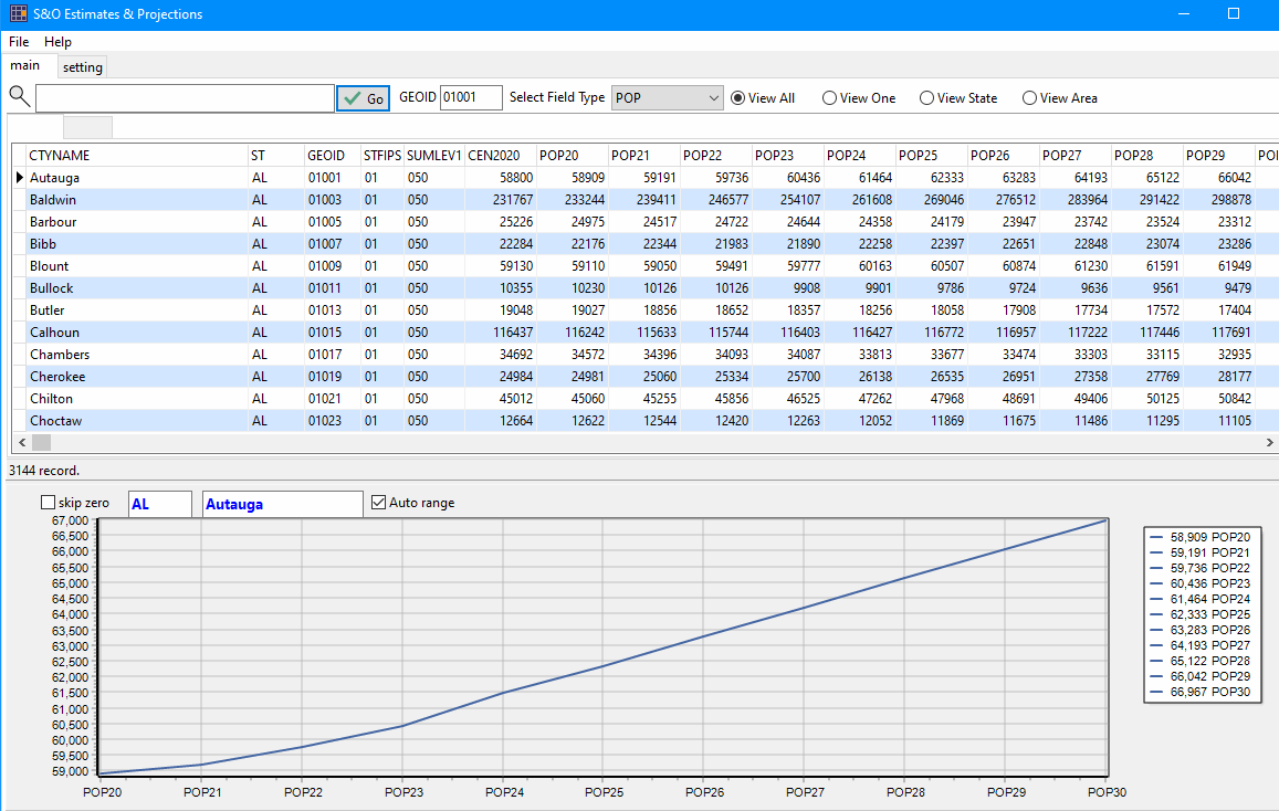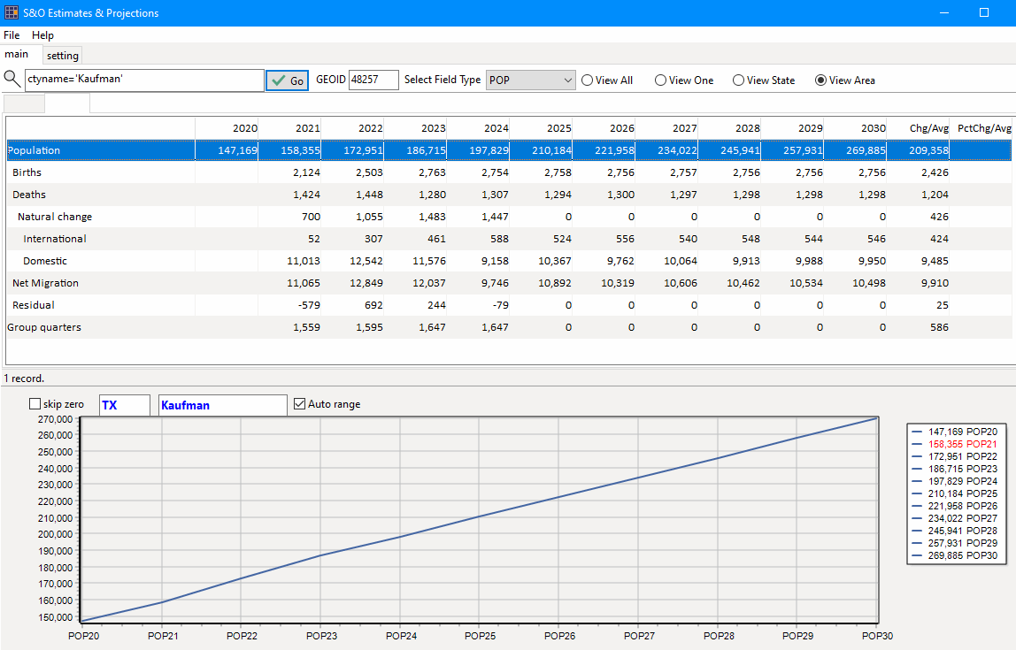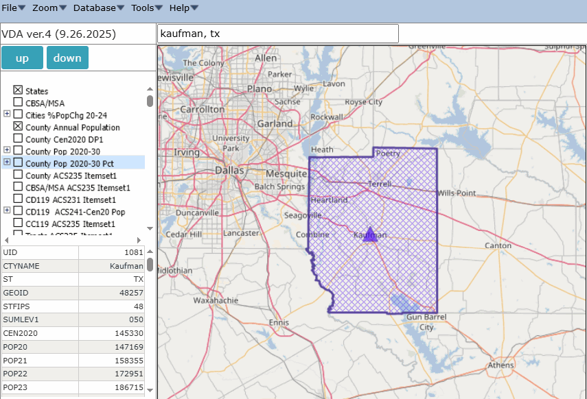 -- analyzing estimates and projections The Federal government does not produce county level projections. The Census Bureau produces county population estimates (vintages) annually, released in March. The 2024 Vintage estimates (2020 through 2024) are used in other programs such as the 2024 American Community Survey. In 2025, the most current vintage is the 2024 Vintage which will be updated/revised in March 2026, and referred to as the 2025 Vintage. The Situation & Outlook Estimates & Projections (SOEP) tool can ne used on a Windows computer to develop and examine county level projections annually to 2030 or 2060. This section provides an overview of the tool and an introduction to its use. How to Install and Operate .. install the program and data on a Windows computer into empty folder c:\soep (unzip two files) .. review terms of use; requires userid and password .. start the program c:\soep\soep.exe; optionally make shortcut .. see details Start-up View .. click for larger view ![]() Profile View of How Kaufman County, TX is Changing; 2020-2030 .. the fastest growing county 2020-2030 in the U.S. based these projections. .. click for larger view ![]() The S&O estimates and projections tool has been developed and is maintained by Warren Glimpse, ProximityOne (Alexandria, VA) and Takashi Hamilton, Tsukasa Consulting (Osaka, Japan). Join the Weekly Web Sessions. Learn more about key topics. No cost. See topics and connectivity details; Tuesday, Wednesday and Thursday at 3:00 pm ET. Learn how to use the S&O estimates and projections tool. Using iVDA with the VDA Project .. goto top .. The starting view shows the lower 48 states by county. .. see more about this project at https://proximityone.com/vda_dp.htm Two layers focused on the 2020-2030 projections use the same shapefile: County Pop 2020-2030 -- the population change 2020 to 2030 County Pop 2020-2030 Pct -- the population percent change 2020 to 2030 Use the Tools>Layer Editor to modify either layer; e.g. show the population percent change 2020 to 2030 as a label. View the "County Pop 2020-2030 Pct" with these four steps: .. uncheck the "County Annual Population" layer .. check on the "County Pop 2020-2030 Pct" layer .. expand the "County Pop 2020-2030 Pct" layer legend .. zoom to areas of interest Viewing Kaufman County, TX with iVDA and VDA GIS project .. the fastest growing county 2020-2030 in the U.S. based these projections. ![]() Details of Operation go to top Methodology & Vintages go to top Demographic projections presented in this section are developed using an annual time series model. The population in period t (P[t]) for a county is defined/projected using the identity: P[t]:=P[t-1]+B[t]-D[t]+IM[t]+DM[t], where: - P[t] -- resident population as of 7/1/t - P[t-1] -- resident population as of 7/1/t - B[t] -- births during the period 6/30/t-1 to 7/1/t - D[t] -- deaths during the period 6/30/t-1 to 7/1/t - IM[t] -- international migration during the period 6/30/t-1 to 7/1/t - DM[t] -- domestic during the period 6/30/t-1 to 7/1/t Projections are developed as vintages (released on a certain date). County projections are developed annually and are updated in March and July .. the July update integrates updated age, race/origin and gender detail .. data presented in the table are extracts showing total population every 10 years .. the underlying dataset includes annual data for many items used in the model Projections are developed for various scenarios. .. the option 2 scenario uses these assumptions: .. crude birth rate declines over time .. crude death rate increases over time .. migration follows patterns exhibited during the period 2010-2020 .. historical annual data for the period 2010 through 2020 use Census Bureau estimates .. some counties are adjusted for specific circumstances Different model specifications and vintages will have different projected values. Terms of Use .. goto top The Situation & Outlook Estimates & Projections (SOEP) tool is available for the exclusive use of the ProximityOne User Group members. The SOEP tool may not be redistributed. There are no warranties for any aspect of SOEP tool. ProximityOne User Group .. goto top Join the ProximityOne User Group to keep up-to-date with new developments relating to metros and component geography decision-making information resources. Receive updates and access to tools and resources available only to members. Use this form to join the User Group. Support Using these Resources Learn more about accessing and using demographic-economic data and related analytical tools. Join us in a Web session. There is no fee for these one-hour Web sessions. Each informal session is focused on a specific topic. The open structure also provides for Q&A and discussion of application issues of interest to participants. Additional Information ProximityOne develops geodemographic-economic data and analytical tools and helps organizations knit together and use diverse data in a decision-making and analytical framework. We develop custom demographic/economic estimates and projections, develop geographic and geocoded address files, and assist with impact and geospatial analyses. Wide-ranging organizations use our tools (software, data, methodologies) to analyze their own data integrated with other data. Contact us (888-364-7656) with questions about data covered in this section or to discuss custom estimates, projections or analyses for your areas of interest. |