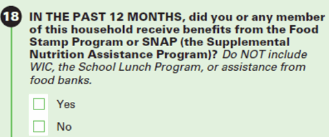 SNAP Operation SNAP is a federal-state program. At the federal level SNAP is overseen by the Food and Nutrition Service (FNS), U.S. Department of Agriculture. USDA/FNS sets national rules and regulations for eligibility, benefit levels, and administrative procedures, funds the program, and authorizing and monitoring the retail stores. State agencies processing applications and determining the eligibility of households, calculating the monthly benefit amount for eligible households, issues the benefits onto the Electronic Benefit Transfer (EBT) cards and administering the program at the local level through county or city offices. The current SNAP costs approximately $100 billion annually, mostly distributed to recipients. The average recipient revcieves $188. SNAP Participation On average, around 42 million Americans received SNAP benefits per month in recent fiscal years (FY 2023-24). The share of population receiving SNAP is 1 in 8 Americans, or about 12.3% of the U.S. population. The national participation rate was estimated at 88% of all eligible individuals. The age distribution of SNAP beneficaries is children (under 18) 39%, working age adults (18-59) 42%, and older adults (60+) 19%. American Community Survey SNAP Data Characteristics of household's receipt of Supplemental Nutrition Assistance Program (SNAP) are determined by a question collected annually as a part of the American Community Survey program. These data are used to create statistics about participation in food assistance programs for planning and funding government programs Question as it Appears on Form