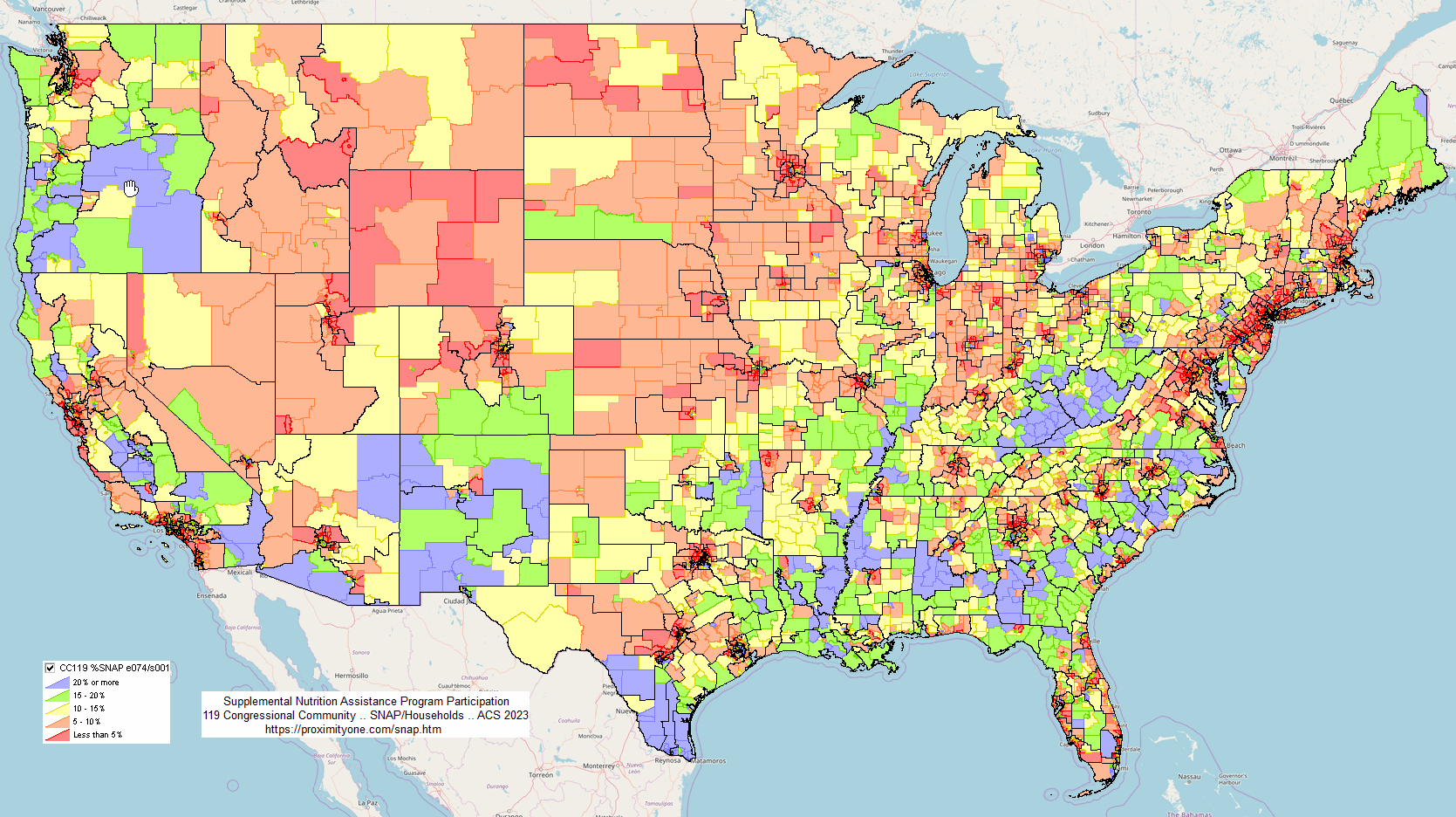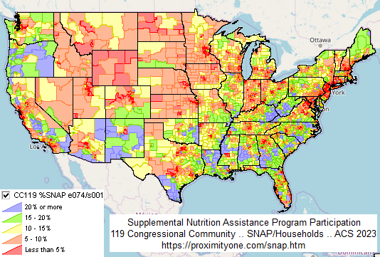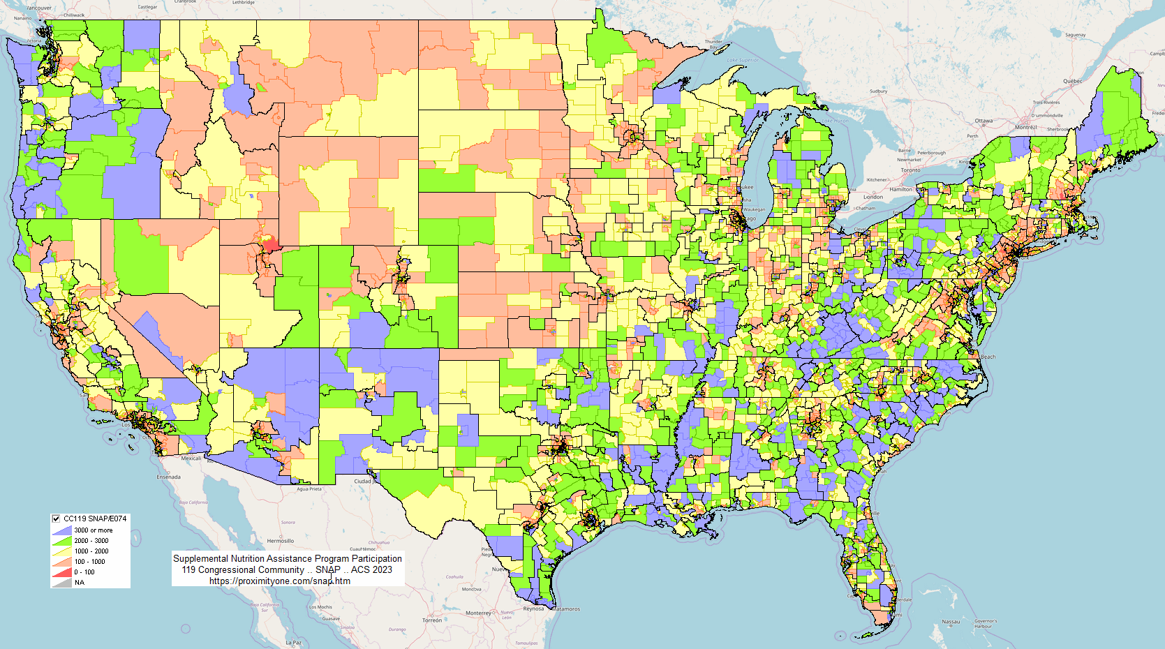 this section will be update on 11/18/25 and is now is a state of preparation. SNAP Participation by Congressional Community ACS2023 .. this map provides summary characteristics about 2023 SNAP recipients based on ACS 2023. .. data are shown for Congressional Communities that are precise subdivisions of 119th Congressional Districts. .. patterns (see legend) show the number of SNAP recipients by 119th Congressionsl Community. .. click for larger view with 119th Congressional Districts .. see below for more detail.