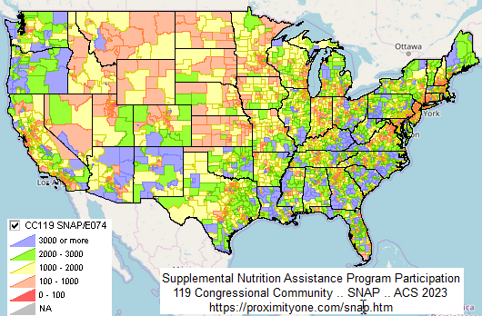 Supplemental Nutrition Assistance Program (SNAP) is a Federal government program in the United States. It is the largest anti-hunger program in America, designed to help low- and no-income individuals and families afford the nutritious food essential to health and well-being. SNAP provides monthly financial assistance specifically for purchasing groceries. SNAP benefits are distributed on an Electronic Benefit Transfer (EBT) card, which works like a debit card at authorized stores. SNAP is the current official name, but it often is called "Food Stamps." To qualify, households must generally meet specific income and resource limits, which are uniform federally but administered by state-level agencies. This section provides access to summary charateristics about 2023 SNAP recipients based on the ACS 2023 data. SNAP Participation by Congressional Community ACS2023 .. this section provides summary characteristics about 2023 SNAP recipients based on ACS 2023. .. patterns (see legend) of the number of SNAP recipients by 119th Congressionsl Community. .. click for larger view with 119th Congressional Districts .. see below for more detail.