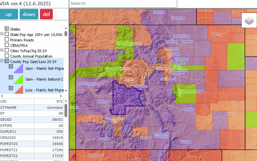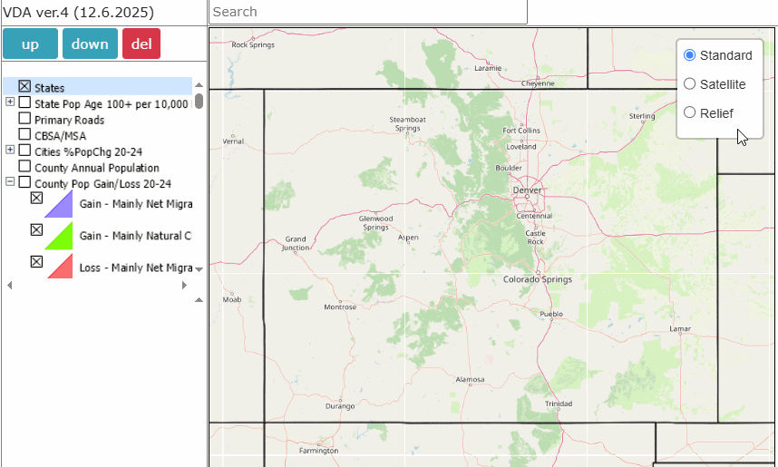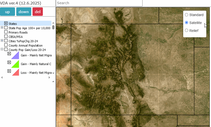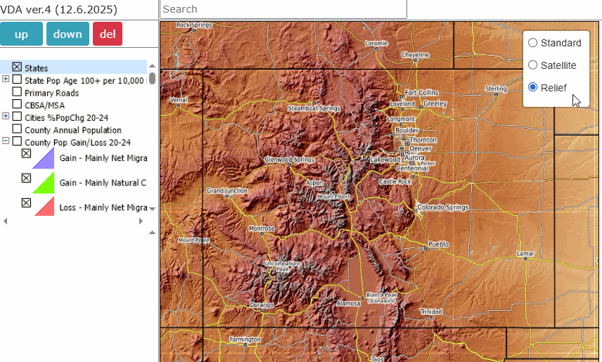 Topographic Maps This section describes three types of topographic maps that can be used with VDA GIS Web or iVDA versions dated 12/6/25 or more recent and any VDA GIS project. The iVDA, shown below, is an embedded variation of the fullscreen VDA GIS Web. The topographic maps are standard, satellite and relief. Each is a global topographic map and is independent of the project used. They may be viewed using the icon that opens as a dropdown located in the upper right corner of the map panel. This is illustrated in the iVDA map shown below. Using iVDA .. The starting view shows the lower 48 states. .. the page being viewed is located at https://proximityone.com/vdagis_topomaps.htm Uncheck the layer named "County Pop Gain/Loss 2020-24" to show state transaparent boundaries to generate these views: Standard Topographic .. goto top ![]() Satellite Topographic .. goto top ![]() Relief Topographic .. goto top ![]() Pattern Analysis with Relief Topographic .. goto top The following view shows a semitransparent pattern view of the "County Pop Gain/Loss 20-24" layer with the Relief Topology and demographic profile (lower left panel) of a selected county. ![]() VDA GIS resources have been developed and are maintained by Warren Glimpse, ProximityOne (Alexandria, VA) and Takashi Hamilton, Tsukasa Consulting (Osaka, Japan). Support Using these Resources Learn more about accessing and using demographic-economic data and related analytical tools. Join us in a Data Analytics Lab session. There is no fee for these one-hour Web sessions. Each informal session is focused on a specific topic. The open structure also provides for Q&A and discussion of application issues of interest to participants. ProximityOne User Group Join the ProximityOne User Group to keep up-to-date with new developments relating to geographic-demographic-economic decision-making information resources. Receive updates and access to tools and resources available only to members. Use this form to join the User Group. Additional Information ProximityOne develops geographic-demographic-economic data and analytical tools and helps organizations knit together and use diverse data in a decision-making and analytical framework. We develop custom demographic/economic estimates and projections, develop geographic and geocoded address files, and assist with impact and geospatial analyses. Wide-ranging organizations use our tools (software, data, methodologies) to analyze their own data integrated with other data. Contact ProximityOne (888-364-7656) with questions about data covered in this section or to discuss custom estimates, projections or analyses for your areas of interest. |
